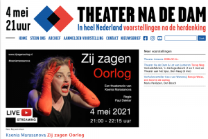 Zij zagen oorlog 4 mei, 21:00 live bij Theater na de Dam 03 mei 2021 / 28 januari 2022 door Ksenia Marasanova Na de Nationale Dodenherdenking worden traditioneel op het podium gerelateerde voorstellingen opgevoerd. Dit jaar is ‘Zij zagen Oorlog’ onderdeel van dat programma. Vanaf 21:00 uur via deze gratis live stream. Lees verder »