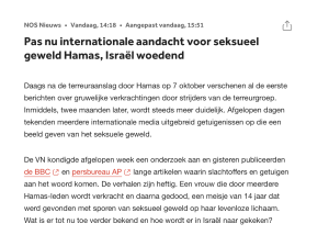 Ksenia - algemeen Weg vertrouwen 06 december 2023 / 06 december 2023 door royalty De NOS, BBC en AP erkennen vandaag (pas!) dat er met burgers gruwelijke dingen zijn gedaan bij de aanval op Israëlische dorpen en het muziekfestival. Dat is ruim twee maanden nadat de eerste films met de ellende online verschenen. Notabene omdat de daders een deel van de ellende zelf streamden. Nu dus ook van de […] Lees verder »